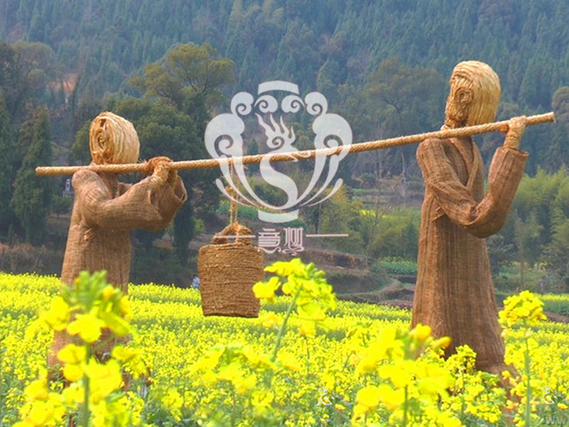現在的精致稻草人藝術通常是由專業美術老師的造型放樣,然后由焊工師傅焊接出立體造型造型,然后以稻草或者稻草繩為材料編捆制作而成。