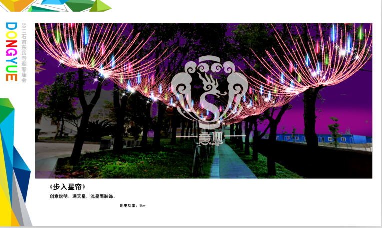 滿懷喜悅,深感榮幸。自貢市意樹文化傳播有限公司通過對湖北荊州石首東岳寺的實地考察,和我們的不懈努力,《湖北荊州石首東岳寺首屆迎春燈會方案》設計工作圓滿完成。我們結合東岳寺特色及氛圍營造亮化區域地形地貌,緊抓“歡慶佳節”的設計主題,把迎春燈會精心打造成2017年迎春的亮點,獻上盛大的視覺歡樂盛宴!