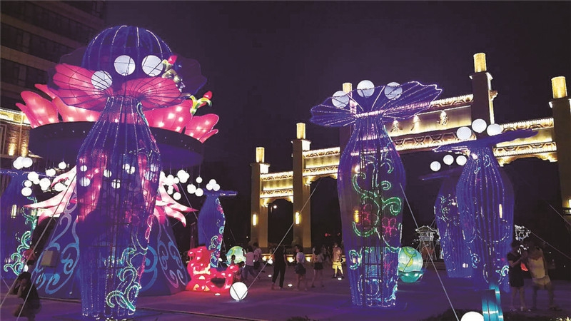 伴隨著夜幕降臨,散落在諾睿德非遺交流中心周圍的彩燈散發(fā)著柔和的光彩,彈著琴的“功夫熊貓”、桃園結(jié)義的劉關(guān)張……一組組彩燈再現(xiàn)影視劇中的經(jīng)典畫面,彰顯著“電影搖籃”的氣質(zhì)。